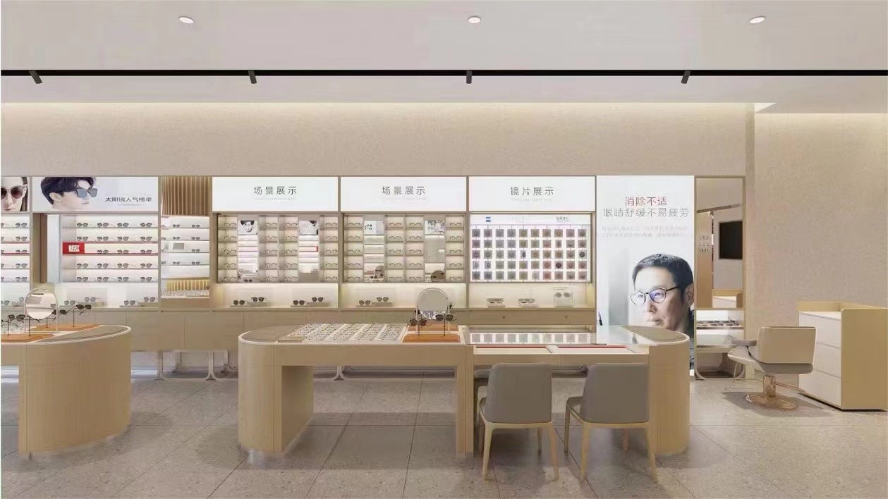 展柜设计:眼镜展柜是展示眼镜的重要工具,设计时应注重实用性和美观性。展柜的高度和角度应方便顾客观察和选择眼镜,同时,照明设备应充足且柔和,以展现眼镜的质感和特点。