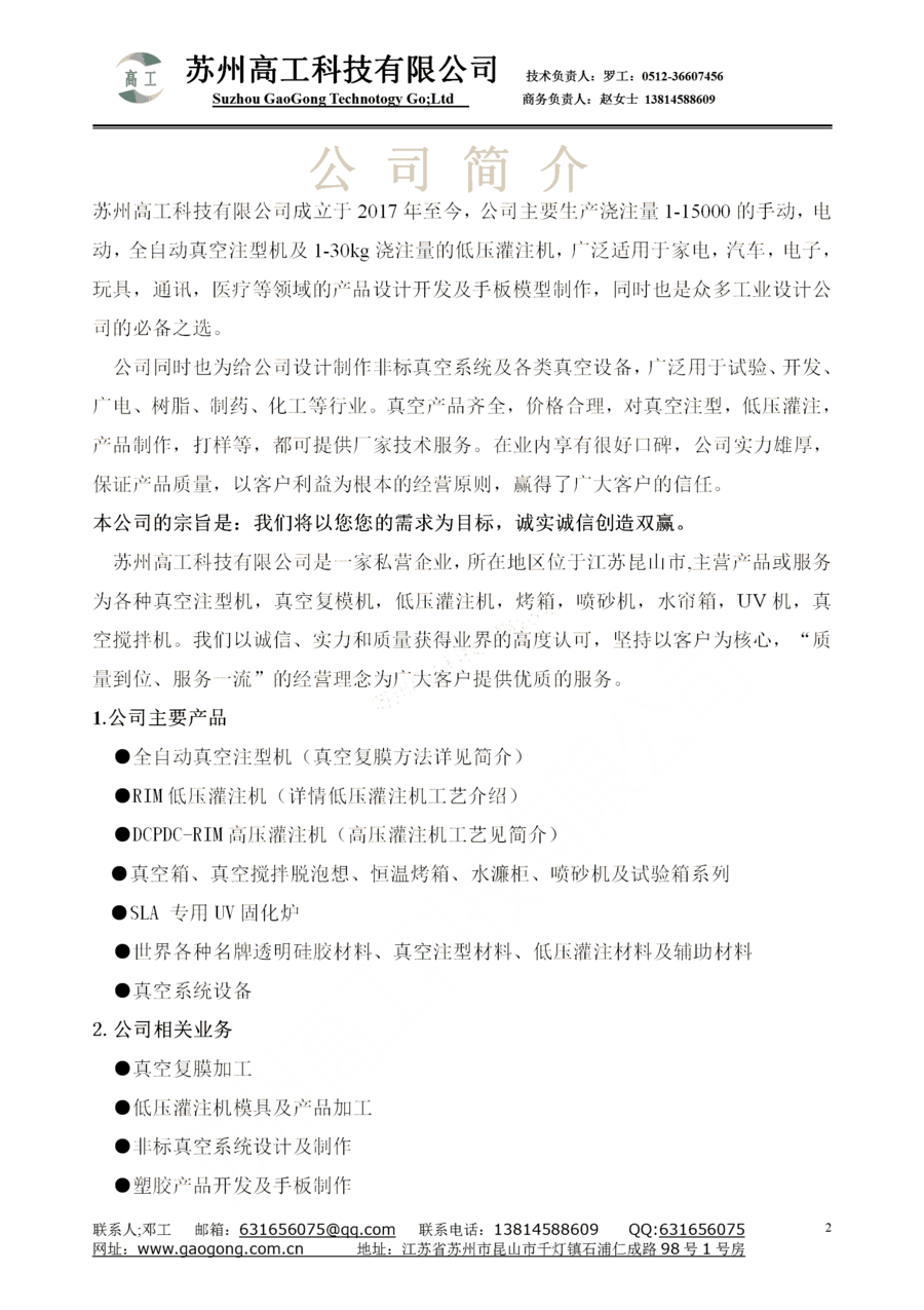 苏州高工科技有限公司成立于2017年至今,公司主要生产浇注量1-15000g的手动,电动,全自动真空注型机及1-30kg浇注量的低压灌注机,广泛适用于家电,汽车,电子,玩具,通讯,医疗等领域的产品设计开发及手板模型制作,公司真空产品齐全,价格合理,对真空注型,低压灌注,产品制作,打样等,都可提供厂家技术服务。公司设备适用于汽车,手机,电子,医疗器材等精密产品,商标,玩具,家电等工业设计与产品研发。所在地区位于江苏省昆山市千灯镇石浦仁成路98号,主营产品或服务为各种真空注型机,真空复模机,低压灌注机,手套箱,恒温烤箱,喷砂机,水帘箱,UV机,真空搅拌机,非标定制真空成套设备。