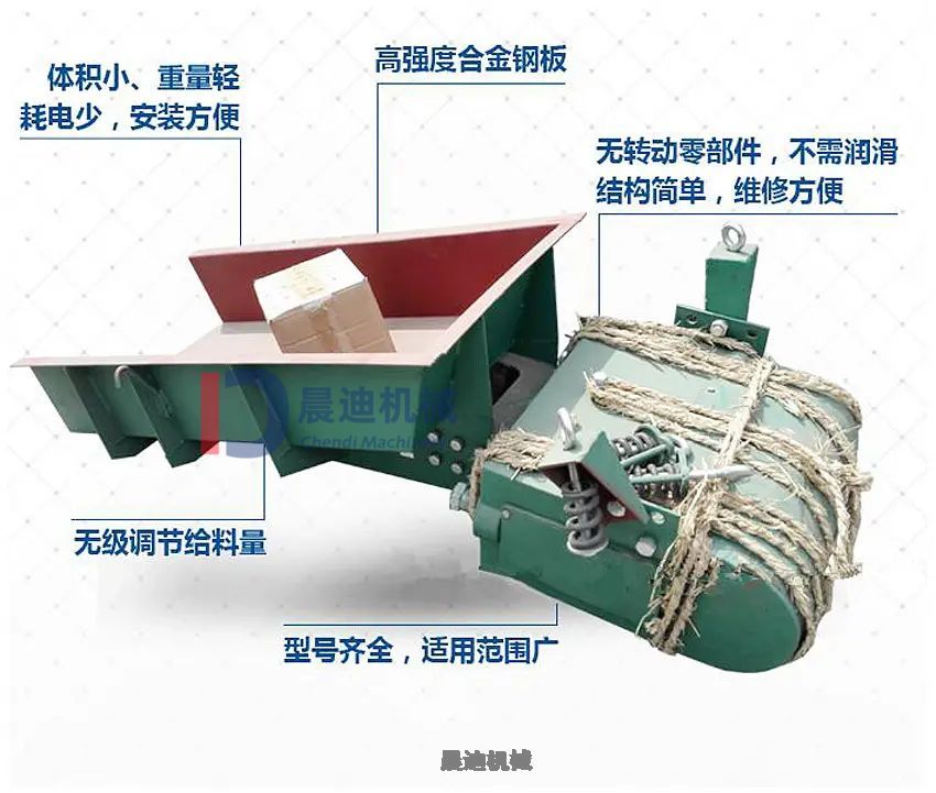 (3)电磁振动给料机槽体可以水平安装,也可以倾斜安装,其给料能力与下倾角度成正比,但下倾角过大容易引起物料自流,难以保证给料精度。因此应根据物料的性质来确定是向上倾斜、向下倾斜,还是水平放置。